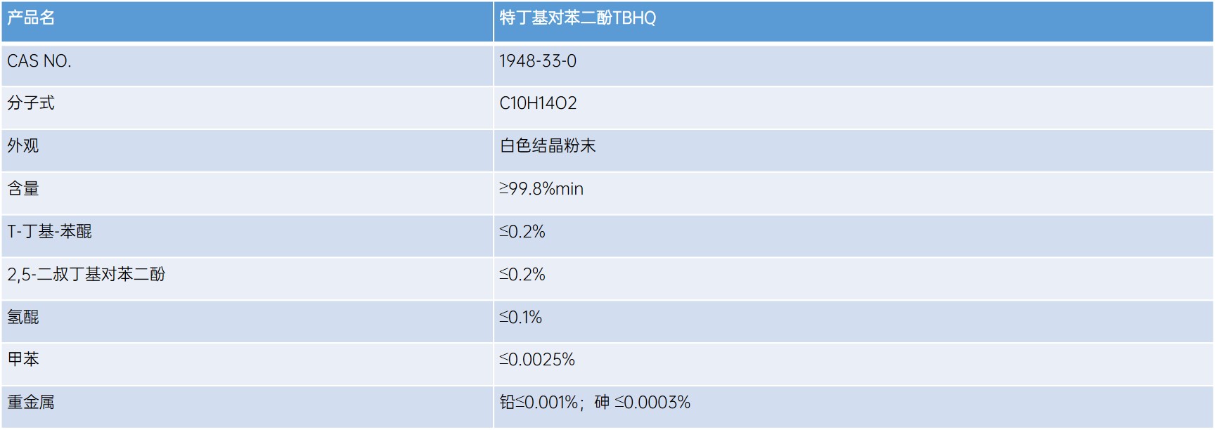 特丁基对苯二酚(TBHQ)是一种油溶性抗氧化剂,具有良好的抗氧化作用,可增强油质在保质期内的稳定性。