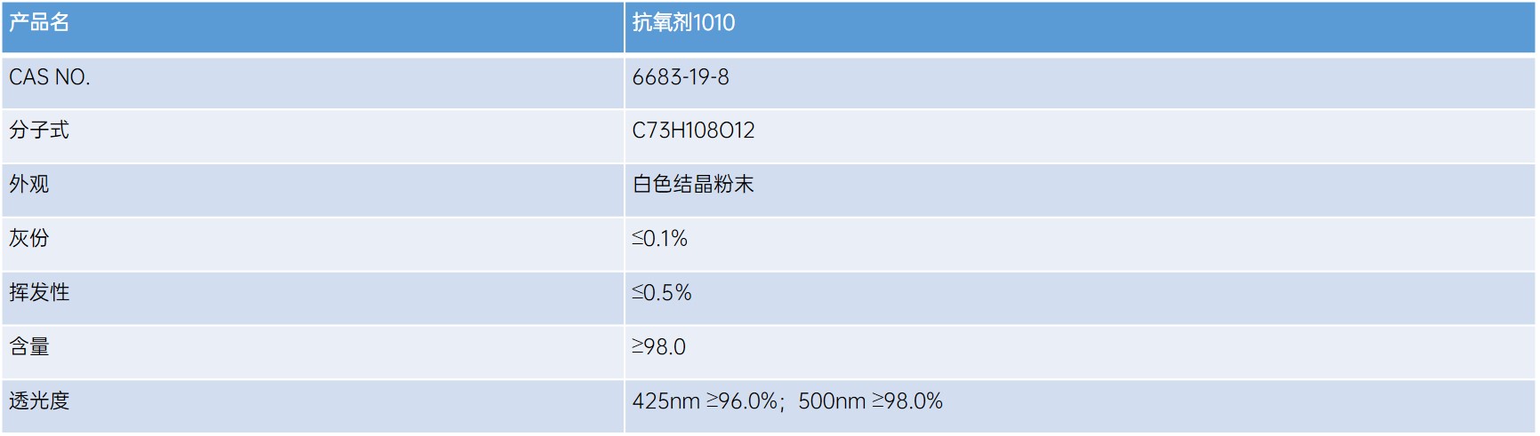 抗氧化剂1010是一种与大多数聚合物兼容的多酚抗氧化剂。对防止光热引起的变色有良好的效果。广泛应用于PE、PP、PS、聚酰胺、聚甲醛、ABS树脂、PVC、合成橡胶等聚合物材料。