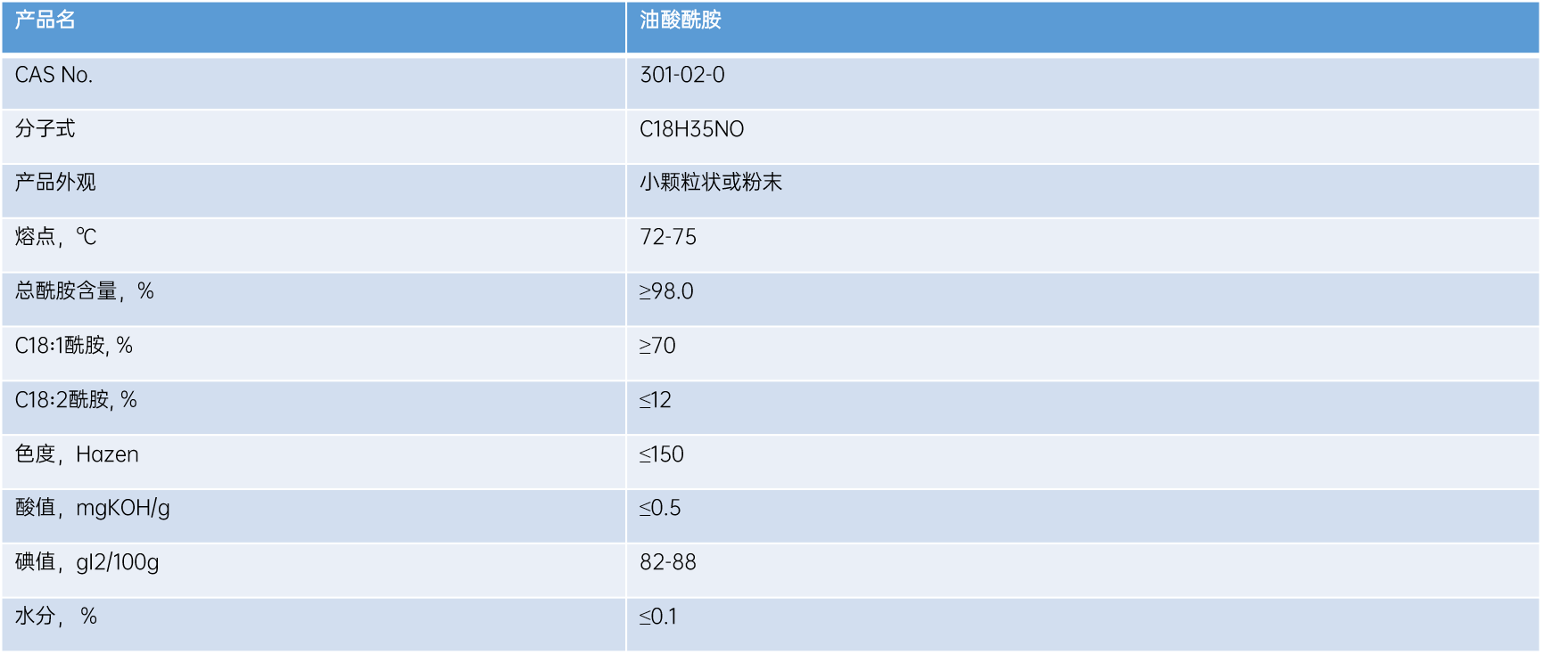 油酸酰胺以天然植物茶籽油脂为主要原料,经过精细工艺制得,产品呈蜡状固体,分子中含有不饱和键(双键),不溶于水,在酮、酯、醇、松节油等溶剂中有相当溶解性,与树脂的相溶性较好。对于多种物质(如染料、颜料、填料)有较好的分散性。