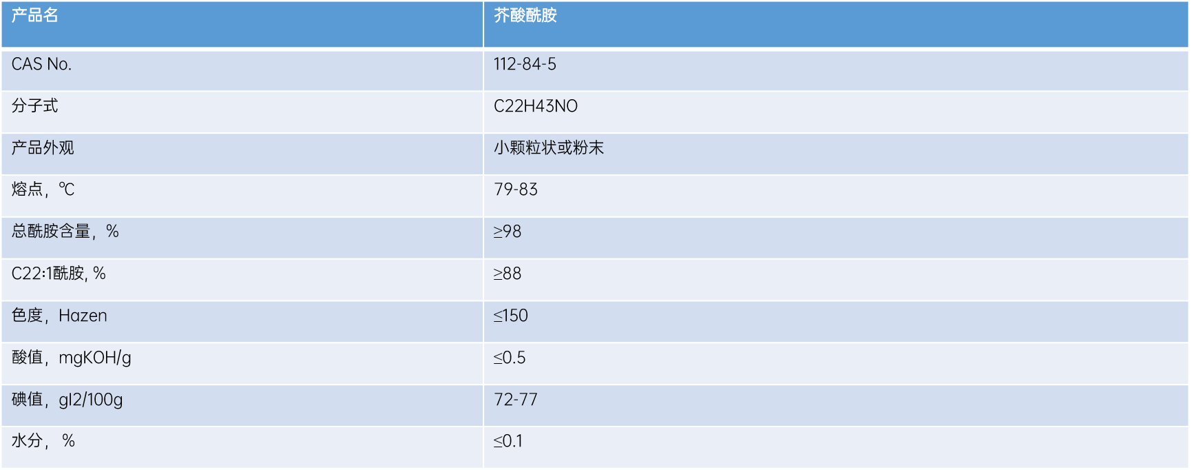 芥酸酰胺为蜡状无异味固体,分子结构中含有较长的碳链和极性的酰胺基,赋予它特别优良的表面活性和良好的耐热稳定性,适合更高的加工温度,以及更持久的爽滑性和更优良的防粘效果。不溶于水,溶于乙醇、乙醚、丙酮和二甲苯等溶剂。环保无毒(通过无毒检测),允许其用于食品容器和食品包装材料中(GB9685-2008),本品已通过SGS绿色环保检测,符合欧盟RoHS环保指令。